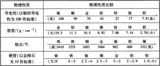 释义 | 金属的物理性质 金属一般有金属光泽,有良好的延展性和可塑性,能导热和弯曲等.铁、铝、银、钛等大多数金属是银白色,铜呈紫红色,金呈黄色,锌呈银灰色.在常温下,铁、铝、铜等大多数金属都是固体,只有汞是液体.金属的导电性、导热性、密度、熔点、硬度等物理性质差别也较大,下表列出了一些金属物理性质的比较. 注意 物质的用途主要由物质的性质决定,但还要考虑价格、资源、是否美观、使用是否便利,以及废料是否易于回收和对环境的影响等多种因素. |