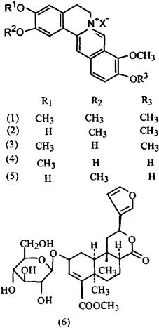 释义 | 金果榄 【名称出处】:《纲目拾遗》引《百草镜》 【概况】: 异名 金楛榄(《药性考》),金古榄(药材名),金牛胆、地苦胆(湖南、广西),九牛胆(广东、广西)、山慈菇(江西、湖南、广东、广西、贵州)。 基源 为防己科青牛胆属植物金果榄的干燥块根。 原植物 金果榄Tinospora capillipes Gagnep. 历史 金果榄为常用中药。《中国药典》记载其来源于两种植物,一为金果榄,一为青牛胆T.sagittata(Oliv.)Gagnep.金果榄始载于《百草镜》。《纲目拾遗》引《百草镜》曰:“出广西,性寒,皮有疙瘩,味苦色黄……。”《药性考》载:“金果榄种交趾,近产于广西苍梧、藤邑(今藤县),蔓生土中,结果如橄榄,皮如白术,剖之色微黄,味苦,土人每凿山穿石或丈许取之。”从以上本草记载,显然是当今习用金果榄类的植物。 形态 多年生常绿缠绕藤本。块根卵圆形、肾形或球形,常数个成串珠样,外皮土黄色,断面白色,粉质,有苦味。 茎有纵条纹,被柔毛。 叶互生,有长柄;叶片近薄革质,卵状箭形,长6~9cm,宽5~6cm,先端急尖,基部圆耳形,全缘,主脉5~7条,背面被疏毛。夏秋间叶腋开黄白色小花,花单性,雌雄异株,数花组成疏散圆锥花序;花萼6片,外轮3片窄,内轮3片宽;花瓣6片,细小;雄蕊6,在雌花中退化成棒状;雌蕊具分离心皮3枚。核果扁圆形,1~3个聚生,熟时红色。 花期3~5月,果期9~11月。(图见《全国中草药汇编》.上册.535页.图550-1) 生境与分布 生于海拔1300m以下山谷、溪边、疏林下或灌丛石隙中。 分布于江西、湖北、湖南、广东、广西、陕西、四川、贵州。。 【生药】: 采集 秋季采挖块根,除去须根和茎,洗净切片,晒干或烘干。 药材主产于四川、湖南、广西。 鉴别 性状 商品块根呈长圆形、陀螺形或不规则形,大小悬殊,长3~7~15cm,直径2~9cm。表面黄色或黄绿色,有细皱纹或较深而密的纵横皱纹。质坚实,横切面黄白色,粉性,皮部甚狭,形成层环隐约可见,木部外缘可见少数导管束,呈放射状。 味极苦。 理化 根的表面及皮部显黄色荧光。 。【化学】:块根含防己内酯(Columbin)、异防己内酯(Isocolumbin)及其葡萄糖甙-金果榄甙(Tinoside)[1]、掌叶防己碱(巴马汀,Palmatine)(1)、药根碱(Jatrorrhizine)(2)、非洲防己碱(Columbamine)(3)、Stepharanine(4)、Dehydrodiscretamine(5)、蝙蝠葛林碱(Menisperine)、木兰碱(Magnoflorine)[2],另含金果榄苦酮素A、B、C、D(Tinocallone A、B、C、D),表金果揽菲甙(Epitinophylloloside)(6),此类化合物为强苦味成分,多有免疫抑制作用[3]。 附 青牛胆[Tinospora sagittate(Oliv)Gagnep]的块根含防己内酯,掌叶防己碱、药根碱等[4]。 参考文献 [1] 化学学报 1988;46(10):1049 [2] Planta Med 1984;50(1):88 [3] Chinese Chemical Letters 1992;3(3):185 [4] 新华本草纲要.第1册.上海科学技术出版社,1988:182 【药理】: 青牛胆块根煎剂用试管稀释法1:400浓度对钩端螺旋体有抑制作用。 参考文献 中草药学.中册.江苏人民出版社,1976:306 【药性】: 性味 苦,寒。 ❶ 《药性考》:“苦,大寒。” 归经 入脾、肾经。 功效 清热解毒,消炎止痛。 主治 扁桃体炎,急性咽喉炎,口腔炎,腮腺炎,乳腺炎,阑尾炎,痈疽疔疮,急慢性肠炎,菌痢,胃痛,热嗽失音。 ❶ 《药性考》:“解毒。咽喉痹急,口烂宜服。 疽痈发背,焮赤疔瘯,蛇蝎虫伤,磨涂。治目痛,耳胀,热嗽,岚瘴,吐衄,一切外症。” 用法用量 内服:煎汤,3~9g,研末,或磨汁。外用:捣敷,研末吹喉或切片含。 使用注意 脾胃虚弱者慎服。 。【临床应用】:配伍应用 ❶ 配黄连、木香,治胃热,泻痢,脘腹疼痛。 ❷ 配冰片吹喉,治咽喉溃烂。 方选和验方 ❶ 二金汤(《中药临床应用》)治急性咽炎,扁桃体炎,咽喉肿痛,有吞咽困难者:金果榄、金银花各15g,岗梅根30g,崩大碗12g,山薄荷3g。 水煎服。 单方应用 ❶ 《百草镜》:“治咽喉一切症:金果榄3~6g。水煎服。” ” ” ” ” |