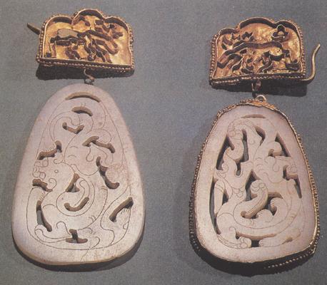 释义 | 金玉耳坠 ◎西汉(匈奴) 内蒙古准格尔西沟畔墓葬出土 金饰件长3厘米 宽4厘米 厚0.3厘米 玉坠长6.5厘米 宽5厘米 厚0.4厘米/内蒙古自治区准格尔旗文化馆藏 ●此品由金饰件与玉坠组成。 饰件部分为压印的朵云形,周边密饰连珠纹,并随形立边框。框内金片立兽似糜鹿(一说似龙或虎),其内原嵌碎玉片,发现时多已失脱。 饰件后背的中下部粘接七个金质管状孔,中心管孔内设有金钩,以与玉坠勾连。玉坠为扁平卵形,通体洁白,镂刻兽形纹。 一件为龙纹,一件为螭虎纹。龙纹坠边饰尚存连珠纹金镶片,上部有圆扣环。 另一件边饰脱失。此耳坠的整体造型风格古朴、粗犷,明显看出受中原文化与西域文化的影响,说明当时各民族文化的交融。 |