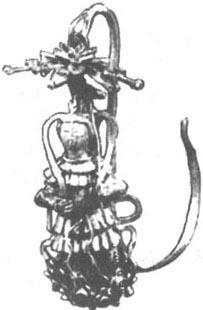 耳环,是古代妇女戴于耳垂上的饰物。 田艺蘅《留青日札》云:“女子穿耳,带以耳环,盖自古有之。”古代妇女的耳饰,除了耳环,还有耳坠,一般认为它是从耳环发展而来,是在耳环之下垂挂著珠玉、宝石的装饰品。 从概念上说,耳环、耳坠应有所区别,但在实际上,这两者至少在明代,基本上是同义的。 《三才图会》附载的耳环图像,按一般看法应属耳坠,《天水冰山录》中开列的耳环、耳坠名目,多有相同,如“金厢玉灯笼耳环”与“金宝灯笼耳坠”,“金累丝灯笼耳环”与“金累丝灯笼耳坠”,此外,在考古发掘报告中同样形制的耳饰,或称为耳环,或称为耳坠,即以本书而言,既有“紫瑛金环”,又有“金镶紫瑛坠子”等等。据此,我们可以认为,在本书中“耳环”与“耳坠”是同义的。当时耳环的形制一般是以金属细丝弯成一圈状圆弧形,一头尖锐,便于穿戴,另一头镶缀有珠玉坠饰。  |