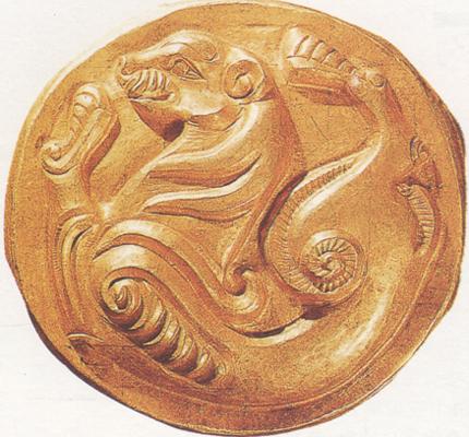 释义 | 金虎纹圆形饰 ◎佩饰品/战国 1977年新疆托克逊阿拉沟30号匈奴墓出土 直径约6厘米 重21.25克 金/新疆维吾尔自治区社会科学院考古研究所藏 ●此饰物呈圆形,其上模压团形虎纹,虎首上仰,目视前方,唇角上翘,头前颈后各伸一爪,胸部雕有螺旋式纹样,虎尾盘附于胯部,圆形凸腹光素无纹。 金虎纹圆形饰系用纯金模压而成。虎面透出温顺驯服之状,虎爪前后伸展状似腾跃。 虎纹形体安排不求写实,但求整体以变形手法适合于圆形之中。 以凸面为主,用线刻划,线条疏朗而粗犷,富于韵律,整体感很强,装饰效果显著。 |