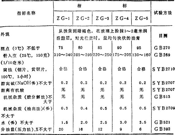释义 | 钙基润滑脂 本产品是由动植物油钙皂和矿物油制得的耐水、中滴点的普通钙基润滑脂。 本产品按针入度分为五个牌号,其代号分为ZG-1、ZG2、ZG-3、ZG-4、ZG-5。其使用温度为:ZG-1、ZG-2不高于55℃;ZG-3、ZG-4不高于60℃;ZG-5不高于65℃。 表1-112 钙基润滑剂质量标准(SY491-65) |