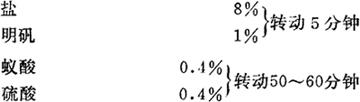 释义 | 铬鞣黄牛排球革 1.原料皮 选用小中皮为主,干皮以5公斤以上或盐鲜皮10公斤以上为好。 2.浸水(以干皮为例) 参考:本章五黄牛篮、足球革。 3.转灰碱法脱毛 参考:本章五黄牛篮、足球革。 4.剖层 厚度要求 2.4~2.6毫米 5.脱灰 (1)流水洗40~50分钟 (2)脱灰 液比 1.2 温度 冬季 28~32℃(盐皮低,干皮高) 夏季 20~25℃(同上) 硫酸铵 1.2~1.4%(同上) 时间 40~50分钟 要求酚酞指示剂对切口无色。 6.软化 液比 1 温度 37~38℃ 硫酸铵 0.5% 胰酶 0.02% 时间 20~30分钟 结束后再用流水洗10~15分钟。 7.浸酸和鞣制 液比 0.8 温度 18~22℃ 要求甲基红指示剂对切口显示全部红色或中间留 硫酸化蓖麻油 1%转动15分钟 40%碱度铬鞣液折红矾4%,转动1小时 醋酸钠 1%,转动2小时 小苏打 0.6~1%(分两次加入,每次间隔半小时,转动2小时) 加热水,要求结束时液比为1.3~1.5,浴液温度45~46℃,在制品收缩温度不低于100℃。 8.静置→分类→挤水→转木屑→削匀→称重 除正身削匀厚度要求2.6~2.7毫米(双层)以外,其余参考:本章五中黄牛篮、足球革。 9.铬复鞣 液比 利用原鞣液 温度 48~50℃ 46~48%碱度铬鞣液折红矾 1% 时间 1小时 10.静置→水洗→中和→水洗 11.中和 (1)水洗 用液比为3的水闷洗两次各20分钟。 (2)中和 液比 1.5 温度 36℃左右 大苏打 扩散剂N 氯化钡 1.5%转动20分钟 元明粉 1.5%转动20分钟 小苏打 0.3~0.4%转动20分钟 (3)水洗 用流水洗20~30分钟。 12.乳液加油 液比 1.5 温度 50℃ 揩光浆 1% 硫酸化蓖麻油 3% 五氯酚钠 0.65% 时间 40分钟 13.整理 工艺流程 揩油(注❶ )——干燥(注❷ )——静置(注❸ )——平展(注❹ )——干燥(注❺ )——静置(注❻ )——绷框伸展(或钉板)(注❼ )——干燥(注❽ )——去油渍(注❾ )——净面(注❿ )——刷浆一次(注⑾)——喷浆三~四次——喷光亮剂(注⑾)——喷固定剂(注⑾)——搓纹——成品 注❶ 揩油配比 硫酸化蓖麻油 100斤 鱼油 17斤(浅色的) 软皮白油 33斤 肥皂 3斤 水 100斤 用量2.5~3%(对皮重) 注❷ 第一次干燥至含水分40~45%。 注❸ 第一次干燥后平铺静置12~16小时。 注❹ 平展工作在平展机上进行,横直各1~2次。 注❺ 平展后,干燥至含水分28~35%。 注❻ 第二次干燥后平铺静置3~4昼夜。 注❼ 绷伸展框的分割成背革,钉板的分割成半张革。 注❽ 第三次干燥至含水分16~30%。 注❾ 用酒精2份,醋酸乙酯一份混合液去油渍。 注❿ 用1%平平加水溶液净面。 注⑾刷、喷浆料配比见附录一(九)7。 光亮剂配比见附录一(十)7。 固定剂配比见附录一(十一)。 |
