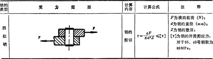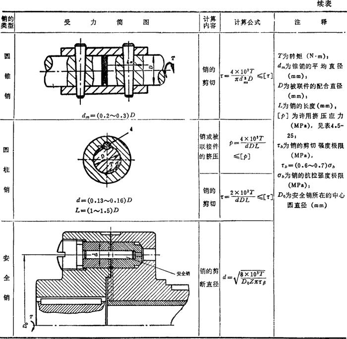 圆柱销、圆锥销、内螺纹圆柱销、螺尾锥销、开口销以及销的强度计算公式分别见表4.5-31~4.5-36。