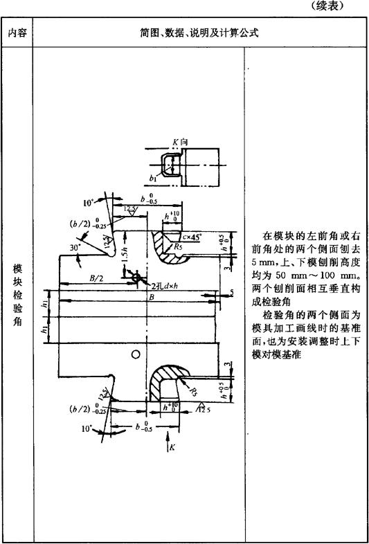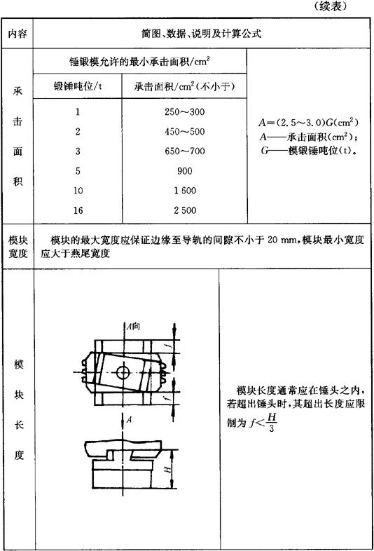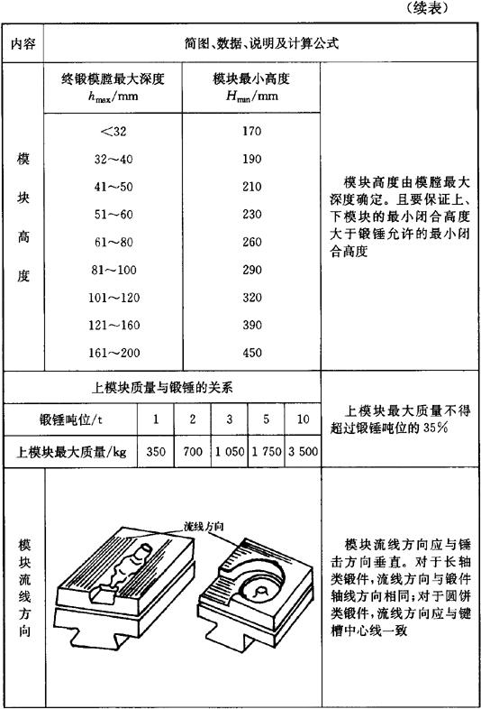 释义 | 锤锻模 (一)锻件图设计 1.分模面 通常所使用的是开式锤上模锻,其锻件分模面的选用原则见表3.2-15。 表3.2-15 锤上模锻锻件分模面的选用原则 飞边槽的尺寸可按以下公式计算: 表3.2-21 钳口尺寸 (mm) 图3.2-12 滚压模膛形式 ❸ 压肩模膛的尺寸见表3.2-26。 ❹ 成型模膛的尺寸见表3.2-27。 ❺ 弯曲模膛的尺寸见表3.2-28。 ❻ 切断模膛常布置在锻模的四角。较典型的切断模膛的形式及尺寸见图3.2-13。 ❼ 压扁台常见的形式见图3.2-14。其尺寸按下式计算: B=B坯+40(mm) L=L坯+40(mm) 式中 B坯、L坯——压扁后毛坯的宽度和长度。 (三)毛坯尺寸的确定 1.长轴类锻件 首先计算出坯料的截面积,其计算公式见表3.2-29。 表3.2-29 锤上制坯的坯料截面积计算 式中 V坯——坯料体积,且V坯=(V锻+V飞)(1+δ)。 然后选择与国标相近的D坯和B坯。 最后确定坯料的长度L坯,其值可按下式计算: (六)模块尺寸(表3.2-32) 表3.2-32 模块尺寸 (七)模块规格(表3.2-33) 表3.2-33 模块截面尺寸规格 (mm) 注:1.模块长度尺寸(l),由需方向供方订货时在合同上规定。 2.模块尺寸的极限偏差规定如下:在高度方向为高度尺寸的+5%;在长度和宽度方向当尺寸<600mm时,为该尺寸的+4%,-1%;当尺寸≥600mm时,为该尺寸的+3%,-1%。 3.模块高度方向的加工余量为20mm(即H+20作为供方供应的模块高度尺寸)。 |