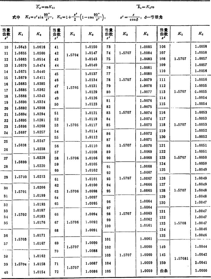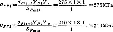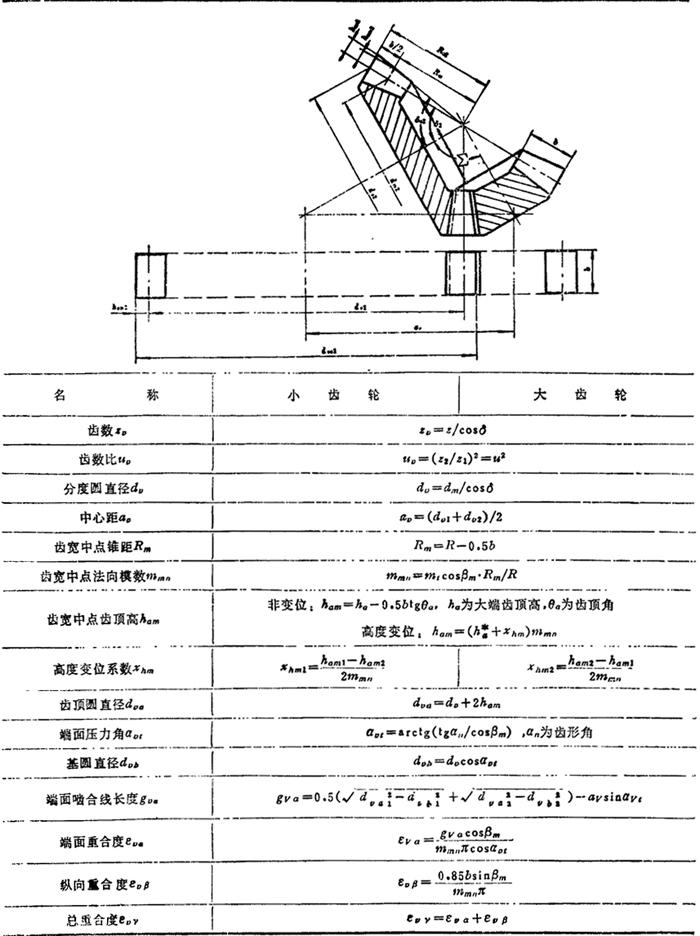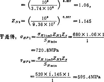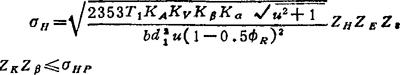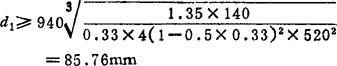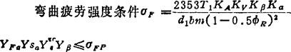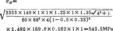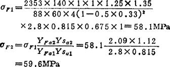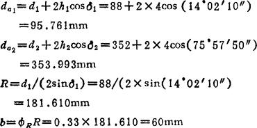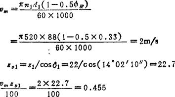 释义 | 锥齿轮传动的设计 直齿锥齿轮最小齿数一般为13,以避免小轮轮齿被根切。若采用变位,则齿数可到10。齿数少,有利于弯曲强度;齿数多,有利于接触强度和传动平稳性。齿宽以取1/3的锥距为宜。通常圆弧齿的螺旋角βm=35°。 锥齿轮齿廓的变位,有切向变位、高度变位和角度变位。切向变位将改变齿轮大端分度圆齿厚。通常小齿轮作正切向变位,大齿轮作负切向变位,以使大小齿轮的弯曲强度接近相等。高度变位也可改变齿轮的分度圆齿厚,还可避免齿数少时产生根切或啮合干涉。通常小齿轮作正高度变位,大齿轮作负高度变位,即x2=-x1。高度变位的同时,也要进行切向变位,以避免由于正高度变位的小齿轮齿顶变尖,并可平衡大小轮齿的强度。角度变位是两齿轮变位系数之和不等于零,即 锥齿轮轮齿受力分析及计算公式见表4.16-55,齿轮主要尺寸的初步计算式见表4.16-56。计算得到小齿轮分度圆直径d1或模数m后,再按表4.16-51或表4.16-52计算齿轮各部尺寸。接触疲劳强度和弯曲疲劳强度校核计算见表4.16-57和4.16-58。锥齿轮的结构及尺寸、当量圆柱齿轮几何参数和标准直齿锥齿轮齿厚及齿高分别见表4.16-59~4.16-61.直齿及曲线齿锥齿轮工作图分别如图4.16-23和4.16-24所示。 表4.16-55 锥齿轮传动受力分析及计算公式 an=20°,ha0/mm=1.25,ρa0/mm=0.25 a-结构钢、调质钢、铸铁;b-渗碳淬火钢、感应淬火钢或火焰淬火钢;c-氮化钢 表4.16-59 锥齿轮的结构 注:∑=90°;dm=d(1-0.5ΦR),为齿宽中点分度圆直径;βm为齿宽中点分度圆螺旋角,由设计确定 表4.16-61 标准直齿锥齿轮分度圆上弦齿厚及弦齿高 注: ❷ 固定弦齿厚和弦齿高,以及分度圆弦齿厚和弦齿高的标注或测量均以大端为基准。 例4.16-7 设计一对闭式直齿锥齿轮传动,已知其主动小锥齿轮上转矩T1=140N·m,转速n=520r/min,传动比i=4,两轴交错角 设计的内容和步骤如下: 选择齿轮材料:参阅表4.16-14和表4.6-15,小锥齿轮选40MnB,调质,HBS1=260~290;大锥齿轮选45钢,调质,HBS2=220~240。 选定疲劳强度极限:由图4.16-21和4.16-22查得,小锥齿轮 选择齿轮精度等级:8级精度(GB11365-89)。 按接触疲劳强度初步计算传动的主要尺寸:按表4.16-56所列直齿小锥齿轮分度圆计算式,并取齿数比u=4,载荷系数K=1.35,齿宽系数ΦR=0.33,许用接触疲劳应力σHP=520MPa,于是, 选取齿数:参照图4.16-15,因齿面调质,硬度较低,应取大于图中的值,故取小锥齿轮齿数z1=22,则大锥齿轮齿数z2=uz1=4×22=88. 确定模数,按表4.16-51,m=d1/z1=88.82/22=4.03mm(取为4mm)。 计算大端分度圆直径:d1=mz1=4×22=88mm; 计算节锥角: δ2=90°-δ1=90°-14°02′10″=75°57′50″ 计算大端齿顶直径、锥距和齿宽: 以上计算完毕,应按表4.14-57所列核算式精确验算齿面接触疲劳强度和齿根弯曲疲劳强度。 接触疲劳强度条件: 其中,使用系数KA=1(见表4.16-20);动载系数 并以降低一级齿轮精度,按图4.16-2查取;按表4.16-58取齿向载荷分布系数Kβ=1.25(小轮悬臂支承);齿间载荷分配系数Ka=1.35(见图4.16-4);节点区域系数 其中,轮齿螺旋角βm=0,故当量基圆螺旋角βvb=0,当量端面压力角avt=tg-1(tgan/cosβvb),即avt=an=20°;同时,取配对材料弹性系数ZF=189.8 式中的当量端面重合度 许用接触疲劳应力: 式中 尺寸系数Zx=1(查图4.16-20);最小安全系数SHmin=1(查表4.16-23)。应力循环次数参考圆柱齿轮传动有关部分: NL1=60γn1t=60×1×520×12000 =3.74×108 NL2=NL1/i=3.74×108/4=9.36×107 σH<σHP2,即满足接触疲劳强度要求,能达到预定的工作小时,而且有裕度,必要时可采用降低齿面硬度或两齿轮直径等措施。 式中 由图4.16-6查得齿形系数YFa1=2.8(zv1=z1/cos 许用弯曲疲劳应力: 其中,尺寸系数Yx=1;最小安全系数SFmin=1(见表4.16-23);寿命系数YN1=1,YN2=1(NL1=3.74×108,NL2=9.36×107,见表4.16-24)。 σF1<σFP1,σF2<σFP2,即两齿轮轮齿都满足弯曲疲劳强度要求,且有较多的裕度,可采用适当减小模数和稍许增加齿数的方法,以改善传动性能。 |