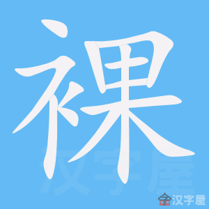 果,既是声旁也是形旁,表示植物结出的籽实。裸,篆文=(亡,无,没有)+(口)+(执,抓)+(衣,服装)+(月,肉,代身体),表示身上没有衣服。篆文异体字是上中下结构的“裏”(用衣服包野果)的变形,表示解开衣服,露出果子。造字本义:脱光衣服,暴露身体。露出上身叫“袒”,暴露全身叫“裸”。