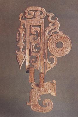 ◎西汉早期 1983年广东广州南越王赵眜墓出土 通长14厘米 宽7.4厘米 厚0.6厘米/广东省广州市南越王墓博物馆藏 ●此佩通长呈不规范的造型,通体扁平,两面纹饰相同。 青色玉料质地,因浸蚀变为鸡骨色。佩上端为云头纹,下接一长方形框架,框内为变形鸟纹。 下端的鸟纹较大,头向上望,尾卷曲与上端云纹相呼应。 因残断使鸟纹缺损不全,用金襻扣加固连结鸟纹组成现图形状。 框左侧上方饰一较小的变形鸟纹,顺缀一组似璎珞状的装饰纹样。框右侧上方设一面向外的立凤,引颈啼鸣,昂胸摆尾,神采动人。立凤双爪立于一个谷纹璧上,造型奇特,立意新巧,别开生面。 |