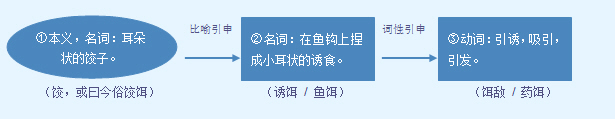 字源解说 耳,既是声旁也是形旁,表示耳状物。饵,侯马盟书 = (食,面食)+ (耳),表示捏成耳朵状的面食品。篆文 承续侯马盟书字形。篆文异体字 = (蒸汽)+ (耳)+ (鬲,煮锅),表示将捏成耳 状的面食放在鬲锅 干蒸 。造字本义:用面皮包裹内馅的饺子,北方著名面食之一。因多用水煮,俗称“水饺”;因制作时将面皮的两边扭绞在一起,捏成耳朵状,又叫“饵”,或“饺饵”。隶化后楷书 将篆文字形中的 写成 ,将篆文字形中的 写成 。俗体楷书 依据草书字形 将正体楷书的 简化成 。 附 文言版《説文解字》:餌,粉饼也。从 ,耳聲。饵, 或从食, 耳聲。 附 白话版《说文解字》:饵,粉饼。字形采用“ ”作边旁,“耳”作声旁。饵,这是“ ”的异体字,字形采用“食”作边旁,采用“耳”作声旁。 引申线索