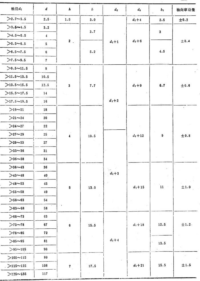释义 | 防尘圈 防尘圈的作用是防尘,不能代替密封圈、油封或其它密封件。 往复运动用防尘圈的结构如图7.7-13所示,用丁腈或聚氨脂橡胶制成,其特点是支承部分尺寸较大,强度好,不需骨架,结构简单,装拆方便,除尘效果好。常用来放在液压缸的端盖,用于括掉活塞杆的灰尘。防尘圈后部与活塞杆之间的间隙σ,其作用是降低唇部与活塞杆表面之间的摩擦阻力和防止产生背压。装防尘圈的活塞杆表面的粗糙度应是:Ra≤0.4~0.1μm,Rz≤0.6~0.4μm。防尘圈标准见GB6578-86,GB10708.3-89。 a)防尘圈结构 b)防尘圈的安装 图7.7-14所示是旋转轴用防尘圈。防尘圈和轴有一定过盈量,和轴一起旋转。一旦粉尘侵入防尘圈外圆和沟槽内径形成的环形槽,即被离心力甩开,而不会通过轴端侵入内部。旋转轴防尘圈结构简单,安装方便,能适应轴的偏心,对轴毫无磨损,具有良好的防尘性,适用于粉尘浓度大的环境。防尘圈和构槽尺寸见表7.7-12。 表7.7-12 旋转轴防尘圈及沟槽尺寸(参见图7.7-14)mm 注:表中d1为轴的直径,d为防尘圈内径,b为防尘圈自然宽度,d2为孔内径,d3为沟槽内径,b1为防尘圈压缩宽度h为防尘圈唇边高度。 |
