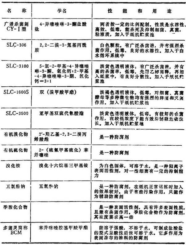 造纸工业早期多采用氯,氯胺等传统消毒剂作为防腐剂、灭菌效率不高。后改用重金属盐(如汞盐、锡盐)和氯酚类化合物,确有显著杀菌效果,但毒性高,易污染水源,为此目前大都已禁止使用。 当前使用的防腐剂大都为有机溴型、有机硫型或含有氰硫基(hiocyano—SCN)、氢硫基(或称巯基(mercapto—HS—)以及咪唑型(imidazole)、噻唑型(thiozil)的杂环化合物;具有高效、低毒、生物降解性好等特点,现已在高速纸机、中性纸生产等方面得到广泛应用。 目前常用的防腐剂如表10—6—34所示。 表10—6—34  |