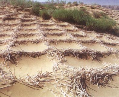 防风固沙区主导功能是防风固沙,减少沙尘暴的危害,辅助功能是保护生物多样性和涵养水源。 国家对这类区域的政策是:保护草原、沙区的湖泊、湿地,保障生态用水;严格保护现有自然、良好的草、灌、林植被;保护珍稀野生动植物栖息地与集中分布区;自然与人工相结合,恢复退化植被,治理沙化土地。主要措施是:建设水源保护区或自然保护区,设立禁牧区、禁垦区、禁采区;制止滥采、滥挖野生中草药材,合理规划和鼓励开展人工生产基地建设;严格控制载畜量,建立禁牧、限牧、轮牧制度,建设人工饲料基地,鼓励舍饲养殖;围栏封育退化草地、灌丛,开展退耕还林还草、农村新能源建设和生态移民工程;组织生态旅游、生态农业等生态产业示范和推广,发展绿色食品、有机食品等名优特产品。  宁夏中卫防沙治沙工程的防沙草方格 |