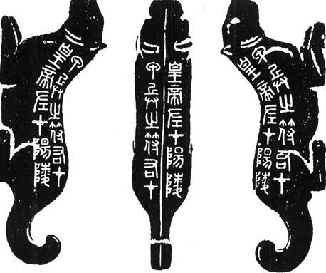 【简介】: 战国末年秦国所作。虎符爲古代帝王调动军队的信物,符呈卧虎形,背上刻有文字,分爲左右两半。阳陵虎符高3.14cm,长8.9cm。相传出土于山东临城,现藏中国历史博物馆。此符两半各刻有篆书铭文两行,共二十四字。文物出版社《商周靑铜器铭文选》收入。 【集评】: 近代王国维《观堂集林》:“文字谨严宽博,骨劲肉丰,与《秦山》、《琅琊台》刻石大小虽异而体势正同……此符乃秦重器,必相斯所书,而二十四字字字淸晰,谨严浑厚,径不过数分,而有寻丈之势,当爲秦书之冠。” 【赏析】:   阳陵虎符上所刻二十四字,字体爲秦始皇书同文字以前通行的小篆。线条圆润饱满,结体严谨匀称,字形略呈长方,无论是起笔收笔还是转折处,都圆转而不露痕迹,与秦代的《泰山刻石》、《峄山刻石》等石刻字体风格十分相同。同时,由于虎符上的文字係铸刻而成,故与简帛文书上的墨迹不甚相同,而与印章上面的字形相类似,一望即知是秦代书法的典型风貌。 另有新郪虎符,四行四十二字。其文字与阳陵虎符同属书同文字前的小篆,但字形间有长方与正方形变化,因而显得更加活泼自然。 |