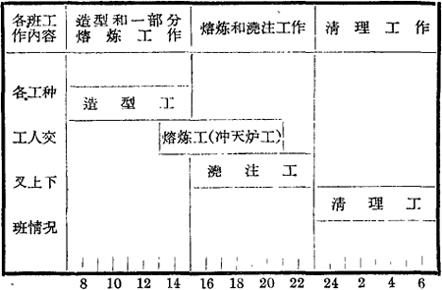释义 | 阶段分工制 是工业企业在实行多班制的条件下,为了适应工艺过程的特殊需要,对各阶段各工种工人采取交叉连续上下班的劳动组织形式。 采用这一制度时,可把生产过程划分为各个生产阶段,根据各阶段各工序的前后关系,合理地安排作息时间,实行交叉连续上巡81班。例如,在机械工业的毛坯铸造过程方面,如果造型、熔炼、浇注与淸理四个主要阶段(工序)的工人,同时上下班,那么,熔炼、浇注必须等待造型,而淸理又必须等待浇注。同时,造型往往要比熔炼提早结束,而熔炼也要比浇注提早结束。这样,工人的工作时间就不能充分利用,生产面积的利用率就会降低。 为了避免上述缺点,可以把各阶段各工种工人的上下班时间错开来,举例图示如下: 这样,就可以使各阶段的时间密切衔接,保证工时和生产面积得到充分利用,并提高劳动生产率。 |