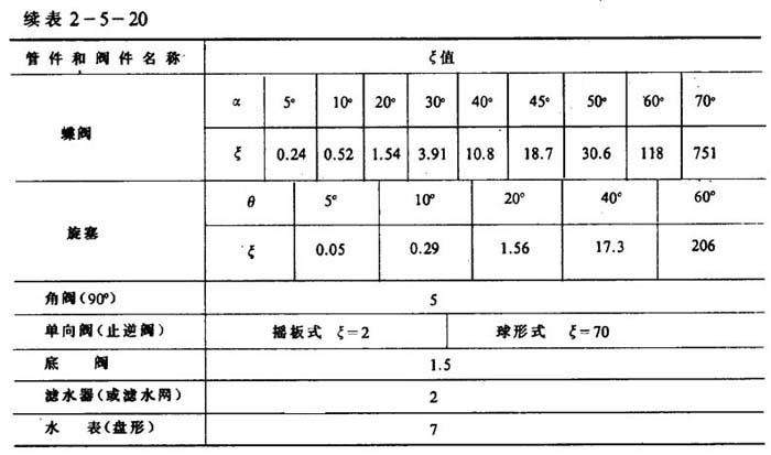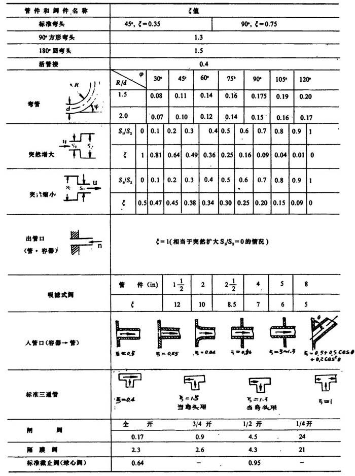 [说明]流体流动时克服局部阻力所引起的能量损失,可以表示为介质流速u2的倍数,这就是阻力系数法。局部阻力系数ξ主要表示局部障碍的几何形状对局部阻力的影响,其值根据局部区域的具体结构,由实验测得,表2-5-20列出了管件和阀件的局部阻力系数,供参考。应说明的是,表中所给的值只是约略值,并不十分精确,以弯头来说,煨制弯头、冲压弯头和焊接弯头的局部阻力系数是不同的;在各种三通中,因管径组合不同,其局部阻力系数也不一样。 表2-5-20 各种管件和阀门的局部阻力系数ξ值    式中 ξ——阻力系数,见表2-5-20  其它同式2-5-17和式2-5-18 |