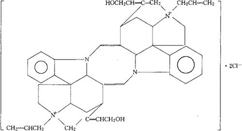 C44H50Cl2N4O2=737.81 CAS-15180-03-7 4,4′-二去甲基-4,4′二-2-丙烯基-毒马钱碱I,-二氯化物。 4,4′-Didemethyl-4,4′-di-2-propenyl-toxiferine I,idichloride. N,N′-二烯丙基去甲毒马钱碱二氯化物。 N,N′-Diallylnortoxiferinium dichlorde. 神经肌肉阻断药。具有明显的肌肉松驰作用,可作为外科手术麻醉的辅助药。 Alcuronium Dichloride,Alloferin,RO 4-3816,Toxiferene,Aloferin,Dialferin,Dialloferin. 二烯丙托锡非林,双丙烯去甲瓢箭素,阿扣罗利。 INN,BAN,JAN,USAN.  |