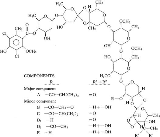 释义 | 阿维霉素 C61H88Cl2O32(Avilamycin A)=1404.25 CAS-11051-71-1 CAS-69787-79-7 [阿维霉素A]O-(IR)-4-C-乙酰-6-脱氧-2,3-O-亚甲基-D-吡喃半乳糖亚基-(1→3-4)-2-O-(2-甲基-1-氧丙基)-α-L-来苏吡喃糖基O-2,6-二脱氧-4-O(3,5-二氯-4-羟基-2-甲氧基-6-甲基苯甲酰基)-β-D-阿拉伯-己吡喃糖基-(1→4)-O-2,6-二脱氧-D-阿拉伯己吡喃糖亚基-(1→3-4)-O-2,6-二脱氧-3-C-甲基-β-D-阿拉伯-己吡喃糖基(1→3)-O-6-脱氧-4-O-甲基-β-D-吡喃半乳糖基-(1→4)-2,6-二-O-甲基-β-D-吡喃甘露糖苷。 [Avilamycin A]O-(1R)-4-C-acetyl-6-deoxy-2,3-Omethylene-D-galactopyranosylidene-(1→3-4)-2-O(2-methyl-1-oxopropyl)-α-L-lyxopyranosyl O-2,6-dideoxy-4-O-(3,5-dichloro-4-hydroxy-2-methoxy-6-methylbenzoyl)-β-D-arabino-hexopyranosyl-(1→4)-O-2,6-dideoxy-D-arabino-hexopyranosylidene-(1→3-4)-O-2,6-dideoxy-3-C-methyl-β-D-arabino-hexopyranosyl-(1→3)-O-6-deoxy-4-O-methyl-β-Dgalactopyranosyl-(1-→4)-2,6-di-O-meth-B-Dmannopyranoside. 抗菌药。 Avilamycin,LY 048 740. INN,BAN,USAN. |