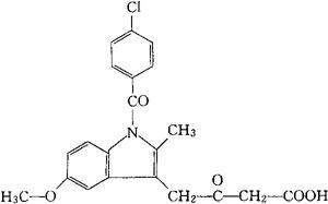 C21H18ClNO6=415.83 CAS-53164-05-9 1-(对-氯苯甲酰基)-5-甲氧基-2-甲基吲哚-3-醋酸的甘醇酸酯。 1-(p-Chlorobenzoyl)-5-methoxy-2-methylindole-3-acetic acid ester with glycolic acid. 1-(4-氯苯甲酰基)-5-甲氧基-2-甲基-1H-吲哚-3-乙酸羧甲基酯。 1-(4-Chlorobenzoyl)-5-methoxy-2-methyl-1H-indole-3-acetic acid carboxymethyl ester. 消炎镇痛药。 醋炎痛。 Acemetacin,Altren,Analgel,Flamarion,Rantudil,Rheutrop,Tilur,Bay,f4975,K 708,TVX1322. INN,BAN,USAN.  |