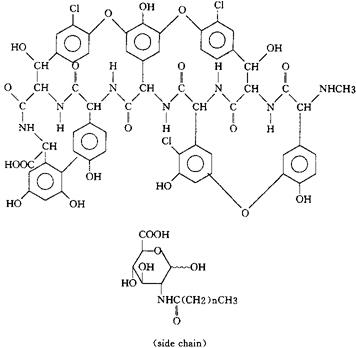 C81H82Cl4N8O30(Aridicin A),C82H84Cl4N8O30(Aridicin B),C83H86Cl4N8O30(Aridicin C),C83H86CI4N8O30(aridicin C2)=7227.69 为阿立地辛A,阿立地辛B,阿立地辛C和阿立地辛C2的混合物,阿立地辛C2是由Kibdelosporangium aridum属,ATCC 39323菌株,(产生)的糖肽抗生素。 A mixture of aridicin A,aridicin B,aridicin C andaridicin C2,the latter are glucopeptide antibiotics derived from anew species of the genus Kibdelosporangium aridum,strain ATCC 39323. 抗生素类药。 Ardacin. INN,USAN.  |