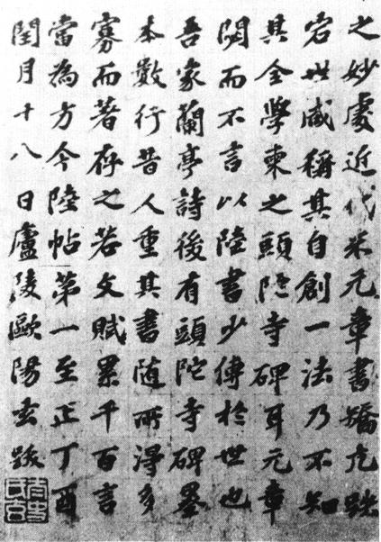 释义 | 陆柬之文赋跋 【简介】: 元·欧阳玄书。纸本。楷书。题跋一则。凡二十行,每行十二字,共二百三十九字。竪25.1cm。台北故宫博物院藏。《石渠宝笈初编》著录。刊于台湾《故宫历代法书全集》(一),载入台湾《故宫书画录》卷一。 【赏析】: 元人书法多蹈唐宋书家之覆辙,崇尙王羲之父子的帖札书法。欧阳玄行书宗法兰亭,同时也受到苏东坡的影响,结体呈扁方形。点画紥实而浑朴劲健,横画瘦劲挺拔,竪画粗短厚重。此幅用正方格框底线,这在历代碑碣中屡见不鲜,看上去整齐统一,但对于行书体来说书写时不能自由发挥,尤其行距过紧而气流不畅,难免给人以侷促之感,如中行“吾家兰亭诗后”笔划较多与末行“闰月十八日”等笔划较少的字相比较,反而疏密不匀。因此行书最好避免每行之字平行,使之气韵贯通。 |
