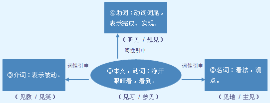 释义 | ![]() (見) (見) 看见;看到: 有空我想跟他~个面|实属罕~。 睹 dǔ ★ “见”适用范围较广。“睹”属于书面语,如说“耳闻目睹、亲眼目睹”。 ❶看,看见;显现出,看得见,看得出。作带宾、带补谓语,宾语可以是非名词性词语。 只~树木不~森林|他~她站在小巷的尽头,撑着把红雨伞|这时,只~一辆小汽车从桥上飞驰而过|这种药真~效果|我的书法怎么老不~进步|这病不~好|这办法很好,很~成效|这幅画我曾经~过一次|这种人我~得多了|你说的那颗星星我怎么没~着? ❷接触,遇到;会见,见面。能重叠。作带宾、带补谓语。 胶卷不能~光|青年人应该~~世面|几年来我只~过他一次。 ❸指明出处或需要参看的地方。作谓语,必带宾语。 详~本书附录|人体的血液循环系统~右图|鸿门宴故事~《史记·项羽本纪》。 对事物的看法;意见。一般不单用。常用在固定词组中,或用作语素构成合成词。 请各位发表真知灼~|小李总爱固执己~|管窥之~|小人之~|高~。 用在动词前面表示被动。书面语。 ~重于当时|~笑于大方之家。 常和动词性语素构成动词(这种动词不能带宾语,隐含的宾语指的总是说话人。) ~教|~谅|~罪|~笑。 【近】 〈动〉瞧 瞅 看 【词语】 见报 见长(cháng) 见地 见风是雨 见缝插针 见怪 见鬼 见好 见机 见教 见猎心喜 见谅 见面 见面礼 见仁见智 见世面 见所未见 见外 见微知著 见习 见笑 见效 见证 字源解说 見,甲骨文 ![]() ![]() ![]() ![]() ![]() 附 文言版《説文解字》:見,視也。从儿从目。凡見之屬皆从見。 附 白话版《说文解字》:见,视,看。字形采用“儿、目”会义。所有与见相关的字,都采用“见”作边旁。 引申线索 ![]() 【字族索引】 见 【同音字】 jiàn xiàn |
