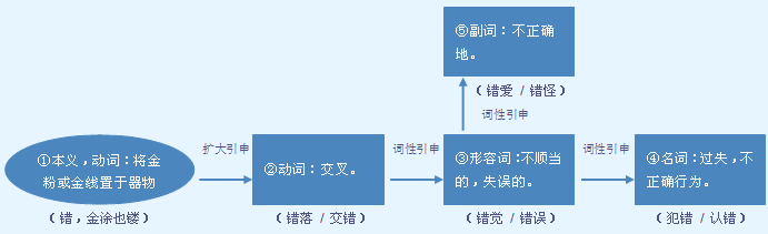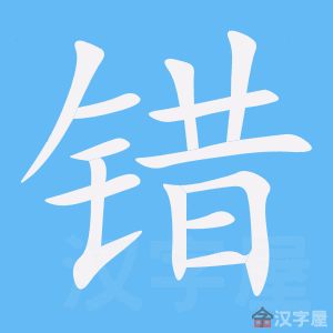 释义 | 错 1 (錯)★★★ 00575名![]() (錯) 错误;不正确: 冤假~案|这是个~觉|法院~判了这个案件。 对 duì 回答~了|这道题目做~了|~错自有分晓。 正 zhèng ~确|判断~误。 ❶不整齐;两个物体相对摩擦。作带宾、带补谓语。 晚上,他经常~牙齿|这儿~进去了一点儿|上下磨盘~得很响。 ❷移动位置、线路、时间,使互不冲突。可重叠。常作带宾、带补谓语,也能构成连动词组作谓语。 你们两个~一~位置,不要挨着坐|事情太多,我实在~不出时间来了|地方小,~不开道|这两个会不能同时开,得~一下|你们几位~开坐。 ❶不正确。 a.作定语,要带“的”。 请你把~的地方指出来。 c.作状语。 他~把好人当成坏人了|他~认了人。 c.作补语。 他做~了事|老人听~了话。 d.作带补谓语。 我的作业~得太多了|你不要再~下去了|爸爸,我~了。 ❷坏;差(用于否定式)。 a.作谓语,可带补语。 他对同志很不~|她们的关系不~|合同书上写清楚了还~得了?|今年的收成~不了。 b.作补语。 这幅画儿画得不~。 (~儿)过错;错处。常作宾语。 没~儿|出~儿|认个~儿|知~改~。 【近】 〈动〉❶磨 ❷挪 移 〈形〉❶误 ❷差 坏 【反】 〈形〉❶对 ❷好 【词语】 错爱 错别字 错车 错处 错怪 错过 错觉 错杂 错字 错综 错综复杂 字源解说 昔,既是声旁也是形旁,是“措”的省略,表示放置。错,篆文 ![]() ![]() ![]() 附 文言版《説文解字》:錯,金涂也。从金昔聲。 附 白话版《说文解字》:错,用金粉涂沫。字形采用“金”作边旁,“昔”作声旁。 引申线索 ![]() 【字族索引】 昔 【同音字】 cuò |