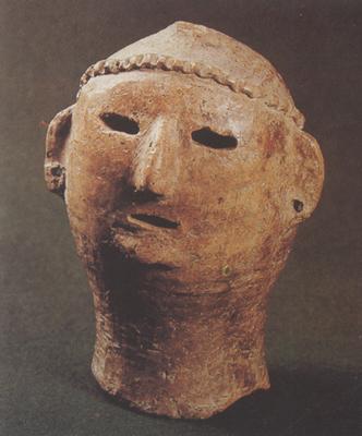 ◎陶塑/新石器时代(仰韶文化晚期) 1964年甘肃礼县高寺头村出土 高12.5厘米 宽8.5厘米 陶质/甘肃省礼县文化馆藏 ●此作系用夹细砂泥烧成,橙黄色,是残存的陶器口部装饰。 人头顶有一孔洞,但很小,说明整个器皿并非生活实用品。人物额头至脑后饰有半圈凸起的装饰带。 眉弓微微隆起,双眼透空,成长圆形;嘴很小,雕空成横条状;鼻子高而直;下颏短小,向前略翘;两耳下端各有一个作垂系饰物用的穿孔。面庞丰满,五官端正,略显秀美,神态温和憨朴,显然是个女性形象。 它在发带、面颊和鼻子等不同部位,使用堆、按、压、刮削和磨光等方法,较准确地表现了它们的不同结构特点与质感。眼与嘴用镂空法,产生浓重的阴影,更使形象显得格外传神。 表明此时原始人在塑造方法上有了多方面的探索。 |