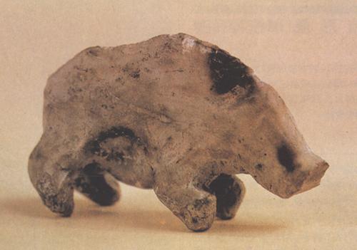 释义 | 陶猪 ◎捏塑/新石器时代(河姆渡文化) 1973至1974年浙江余姚县河姆渡出土 高4.5厘米 宽6.3厘米 陶质/浙江省博物馆藏 ●各类动物是原始社会雕塑的重要题材之一。 这件作品塑造一只家猪,头前伸,嘴端上翘,无耳,眼部模糊不清,弓背,四肢微屈,腹部下垂,好像正在低头疾行。造型简练概括,大的形体和某些局部结构颇为准确。 其中腹部肌肉塑造圆浑,又施几个塑点,其肥胖而松弛之感表现得真实自然。作品舍弃五官的具体刻画,集中塑造形体动作,生动地表现了对象的神态。在烧制过程中形成的几处黑斑块,为作品增添了颜色变化。 |