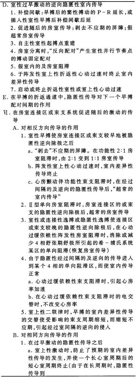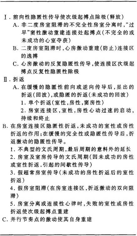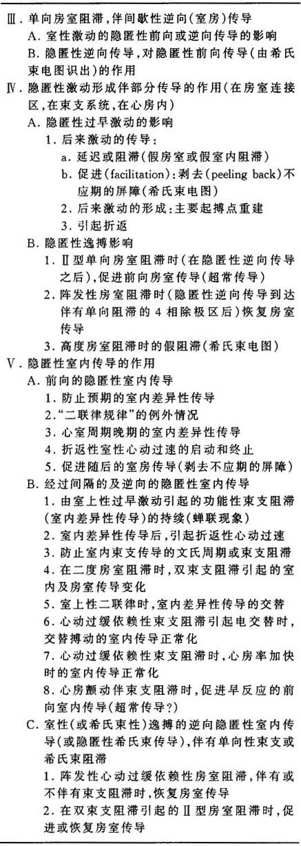 释义 | 隐匿性传导 心律失常的基本现象之一。 当任何一个激动部分地透过了心脏传导组织,虽然未达到心房或心室,但却可以产生新的不应期。由于这些激动所产生的动作电位不足以在体表心电图上直接表现,只能根据对下一次激动所引起的传导障碍或激动起源上(自律性)的变化,而获得间接的诊断依据,故称为隐匿性传导。临床上最早应用隐匿性传导这一概念解释心律失常的是Kaufmann和Rothberger(1927年)。他们认为,在心房扑动伴2∶1心室反应时所见到R-R周期长短交替现象,是由于每隔—个被阻滞的房扑波较深地隐匿性传入房室连接区的结果。 但隐匿性传导这一名词却是在1948年首次见于Langendorf的论著“隐匿性传导:受阻滞冲动对随后的冲动形成与传导的影响”中。1950年,Soderstrom和Moe等观察到,房颤时无规律的心室反应是隐匿性传导的结果。 1956年Katz和Pick详细地概括了隐匿性传导产生的机理。1961年Hoffman,Cranefield和Stuckey实验证实隐匿性传导可见于传导系统的任何部位。1963年,Lau和Damato等人用希氏束电图直接证实了隐匿性房室传导的存在。Hoffman等用微电极的方法进行研究,认为隐匿性传导的发生机理与递减性传导有关。当激动到达传导系统的某一部位时,若该区正处于绝对不应期转向相对不应期的临界期,此时,虽能发生除极,但其所产生的动作电位O相上升速度减慢,振幅降低,并且在传导过程中,这种除极速度与振幅一再减少,以至最后不能传导。这样此激动未能通过传导系统某部的“全程”,因而体表心电图显示不出它的直接表现,但在传导途径中产生了新的不应期或超常期,对随后的激动的传导或形成发生极为复杂的影响。 隐匿性传导可发生在心脏自律传导系统的任何部位,包括窦房联接区、房室连接区、异—房、异—连接、异—室联接处、束支及其分支、浦氏纤维以及房室间的各种旁道。但绝大部分发生于房室连接区。 窦性以及各种异位(房性、连接性、室性)心搏和心律(如过缓的逸搏和过缓的逸搏心律、逸搏和逸搏心律、加速的逸搏和加速的逸搏心律、早搏和早搏性心动过速、扑动和颤动等)等自律性异常都可以引起隐匿性传导。隐匿性传导可以是下行性或逆行性的。 下行性隐匿性传导,是指当窦性、房性或连接性激动通过房室连接区或束支及其分支下传时所形成的隐匿性传导。逆行性隐匿性传导,则指室性激动沿房室连接区或束支及其分支逆传时所形成的隐匿性传导。 此外。激动也能从一侧束支隐匿地传到对侧束支,这是另一种隐匿性传导,一侧束支性心搏产生对侧束支阻滞图形的QRST波,以及左加右束支阻滞时的依赖现象均与束支中隐匿性传导有关。 心脏自律传导系统的隐匿部位所存在的生理性干扰导致的传导延缓或中断,以及病理性阻滞所产生的传导延缓或中断,是形成隐匿性传导的电生理基础。通常以干扰现象尤为多见。从临床观点看,隐匿性传导现象可分为三大类:(1)隐匿性传导影响其后激动的传导(延迟、阻滞、反复的隐匿性传导、促进、显性或隐匿性的折返);(2)隐匿性传导影响其后激动的形成使主导起搏点过早除极(重建);(3)隐匿性传导对后面的激动传导及形成的联合影响。隐匿性传导是构成复杂心律失常的心电图的重要原因之一。 表1 隐匿性传导的表现(无房室旁道) |