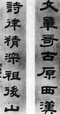 释义 | 隷书七言联 【简介】: 淸·黄易书。纸本。隷书。七言联一则。凡上下联正文十四字,款四字。刊于《历代楹联名迹》。 【赏析】: 此隷书七言对联以方笔爲主,浑厚遒劲,非狼毫不能及,折笔处易方,波脚处易方。尤其注重笔划线条的粗细轻重,方圆转折之分,因而节奏强烈,富有刚柔之变化。线条起伏而流动,如“屋漏痕”,方劲中参以圆润,充分表现了线条的形态美。而交笔处取圆势,以增加线条的丰满感。结体方整,略呈矮扁形,有平直方正近乎缪篆,如“奇”字。长形的字,如“章”、“律”字,将下部长竪令其短。有些字的主长横,写得较长,放纵有致,如“章”、“深”、“西”、“古”等字。有的字结体注意穿揷揖让,别具新意,如“律”、“深”字。此联一明显特点是:笔画粗细相间,笔画少的字,写得特别粗重。如“文”、“古”、“山”。笔画多的字写得略细,如“律”、“精”字。一字中也是粗细间出,如“祖”字“且”旁,左右两竪,一细一粗,成强烈对比。其字变化亦很生动。如“精”字“月”旁,左竪作半弧形。“奇”字下部竪勾,作一圆转小弧鈎,使整幅对联朴实自然,字字生动,变化生新。 |