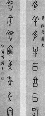 【简介】: 近代·罗振玉书。纸本。甲骨文。上下联各八字,有上下款。《民国时期书法》收入。 【赏析】: 殷墟甲骨文经历了约三个世纪的演变,因其年代、刀具、骨甲质地及书契者的不同,书体呈现出多种风貌。而摹写仿效它们的书家们,也以各自的理解、把握和艺术情趣的不同,创造出了姿态各别的甲骨文体书法作品。 这副对联行笔全用中锋,线条瘦劲匀挺,但作者不“以笔代刀”,去自然地摹拟刀痕起落的尖削状,而以藏锋逆起,轻驻提收,使之骨力内含,爽朗利落。同时行笔转折有致,墨分渴湿,虚和随意,气脉通达。因之,线条匀凈而不单薄,秀劲而不轻滑,挺拔而不僵直,凝练而不滞重。因是对联,章法受到格式的局限,但结体却在均衡、对称、稳定的格局中力求保持甲骨文疏密错综、大小参差、欹斜顾盼的自然之美。作爲文字学家兼书法家的罗振玉,对文字发展史上书体的嬗变进行著理性的、严密的归纳。因而作品总体上字体工整规範,笔法精审考究,体势端庄秀丽,线条遒劲匀润,构成了作品醇古典雅的格调和淸隽舒和的情致。