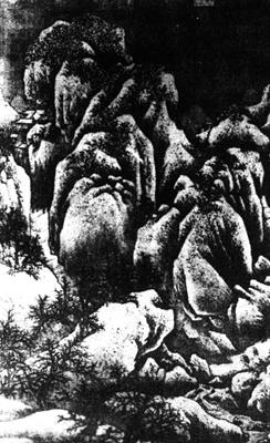 【作品赏析】: 北方山岳雪景。 山形陡峭,折落有势,峰峦岭岫一片银白,山坳深处,可以看到寺庙、楼台。近山远山树木叶落已尽,深黑的枝杈被积雪映衬,更显得苍老枯硬。山下水边有路,似可通向深山古寺,路上有曳杖、荷担者,瑟缩而行。“物态严凝,俨然三冬在目”。 (赵希鹄《古画辩》)关、陇山水的雄浑险峻,严冬季节自然界的沉默,在画上有成功的表现。 前人论范宽画山水,山顶好作密林,水际作突兀大石,落笔雄伟老硬。这些特点在《雪山萧寺图》上都可以看到。但与《溪山行旅图》、《雪景寒林图》对比,可以看出笔法有明显不同,景物描绘较为简率,因此是否范宽真迹,尚待研究。 。  宋 范宽(传) 轴 绢本设色 纵182.4厘米 横108.2厘米 藏台北故宫博物院 |