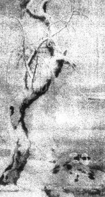 【作品赏析】: 此图画雪中禽鸟。 严冬时节,大雪弥漫,一株古柳身披银装伫立在溪岸之上,弯曲的躯干上,垂挂著几簇绵长而稀疏的枝条,而带雪的枝条上还坠著点点饱含春意的芽苞。柳树的上端,两只斑鸠——一只居高而息,一只在下仰望。 错落的细枝间,一伙麻雀聚集一起,悄然无声。雪岸上,三只野鸭似为避寒取暖而相互偎依著。 另一只野鸭则似乎不安寂寞,远在岸下,伸长颈项,朝树上凝眸而视。禽雀、树木形态自如,静中寓动,别有情韵。 此图笔法简括,墨色湿润,在昌纪作品中属于作风粗简的一种。画禽鸟半上半写,浓淡兼施,毛羽丰满蓬松;画树木阳的一侧轻勾,阴的一侧重抹,墨饱笔挺,既画出了雪迹,又增加了体积感。 树后的天与水,则全用淡墨烘染,既托出禽鸟的毛色,也挤出树身、枝条、滩渚、苇草以及坡岸等景物上的积雪。 整个画面白雪皑皑,水天一色,苍茫深远,十分壮观。 。  明 吕纪 轴 绢本 藏台北故宫博物院 |