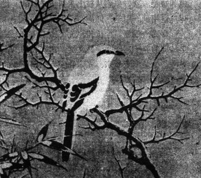 【作品赏析】: 《雪树寒禽图》是巨幅立轴,款“淳熙丁未岁,李迪画。”“淳熙丁未”,即南宋孝宗淳熙十四年(1187),是现在看到的李迪作品中年代最早的一幅。画一遒劲屈曲的枯树于雪中,下有幽竹一丛,枯枝和竹叶上都有积雪。天空用淡墨染成,并洒粉作飞雪之意。整个画面是一个冰雪封盖的世界。天色阴霾,雪霰飞扬,其荒寒可想而知。但高枝栖一鸟,却毛羽丰润,神态自若,毫无号寒冻萎之态,别具一番新音。 此图笔法极为工致,双勾竹叶,劲挺有力。枯枝的盘曲如硬铁,与翎毛的柔细用笔形成了强烈的刚柔对比。虽然用笔略嫌刻板,但仍不失为一幅精美之作。 。  宋 李迪 轴 绢本设色 纵116.1厘米 横53厘米 藏上海博物馆 |