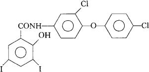 C19H11Cl2l2NO3=626.02 CAS-22662-39-1 N-[3-氯-4-(4-氯苯氧)苯基]-2-羟-3,5-二碘苯甲酰胺。 N-[3-Chloro-4-(4-chlorophenoxy)phenyl]-2-hydroxy-3,5-diiodobenzamide. 3′-氯-4′-(对-氯苯氧)-3,5-二碘水杨酰苯胺。 3′-Chloro-4′-(p-chlorophenxoy)-3,5-diiodosalicylanilide. 抗蠕虫药。 Rafoxanide,Disalan,Flukanide,Ranide,Raniden,Ursovermit,MK 990. INN,BAN,USAN.  |