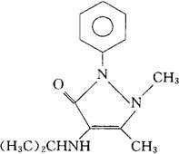 C14H19N3O=245.32 CAS-3615-24-5 4-(异丙氨基)-2,3-二甲基-1-苯基-3-吡唑啉-5-酮。 4-(Isopropylamino)-2,3-dimethyl-1-phenyl-3-pyrazolin-5-one. 1,2-二氢-1,5-二甲基-4-[(1-甲基乙基)氨基]-2-苯基-3H-吡唑-3-酮。 1,2-Dihydro-1,5-dimethyl-4-[(1-methylethyl)amino]-2-phenyl-3H-pyrazol-3-one. 镇痛药,消炎解热药。 Ramifenazone,Isopirina,Isopropylaminophenazone,Isopyrin. INN,USAN.  |