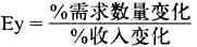 购买数量的变化可能由于购买者收入的变化引起的。 当需求是收入的函数的时候,假定价格和其他变量保持不变,弹性就是需求的收入弹性。可把需求的收入弹性定义为:  这里Ey为收入弹性系数除了某种例外,Ey的符号是正数,这就是说,购买的数量随收入的增加而增加,随收入的减少而减少。当Ey处于0和1之间的时候,就说收入弹性低,而当Ey处于大于1的时候,就说收入弹性高。有低收入弹性的产品和劳务是占购买者预算较小份额的那些产品和劳务。 一般说来,必需品就是属于收入弹性非常低的商品。有高收入弹性的商品是那些其购买额占消费者预算很大比重的商品。 这些商品包括昂贵的耐用品。因此,奢侈品有高收入弹性。虽然房屋占家庭预算的大部分,但它似乎有接近1的收入弹性。负收入弹性适用于所谓劣等品,因为收入的增加将引起对它们购买数量的下降。 |