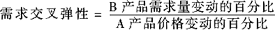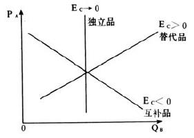 表示一种产品价格的相对变动所引起的相关产品需求量的变动,即指某种产品的需求量对相关产品价格变动的反应程度,以一种产品价格变动的百分比与另一相关产品需求量变动的百分比的比值来表示,即 ,用公式表示为 ,EC为需求的交叉弹性系数,QB为变化前的B产品的需求量,ΔQB为B产品需求的变化量,PA为变化前的A产品的价格,ΔPA为A产品价格的变化量,根据EC值可以测定两种产品间的关系(见图):当EC>0时,交叉弹性系数为正值,两种产品同向运动,一种产品的价格上涨,则另一种产品的需求量上升,反之亦然,这两种产品互为替代品,弹性系数越大,替代性越强;当EC<0时,交叉弹性系数为负值,两种产品反向运动,一种产品价格上涨,则另一种产品的需求量下降,反之亦然,这两种产品为互补产品;当EC→0时,则表示一种产品的价格变化对另一种产品需求量的变化影响甚微,这两种产品互不相关,称为独立品。