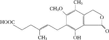 释义 | 霉酚酸 C17H20O6=320.34 CAS-24280-93-1 6-(4-羟基-6-甲氧基-7-甲基-3-氧代-5-邻苯二甲烷基)-4-甲基-4-己烯酸。 6-(4-Hydroxy-6-methoxy-7-methyl-3-oxo-5-phthalanyl)-4-methyl-4-hexenoic acid. 抗感染药。 麦可酚酸。 Mycophenolic Acid,Melbex. INN,NFN,USAN,MI. |