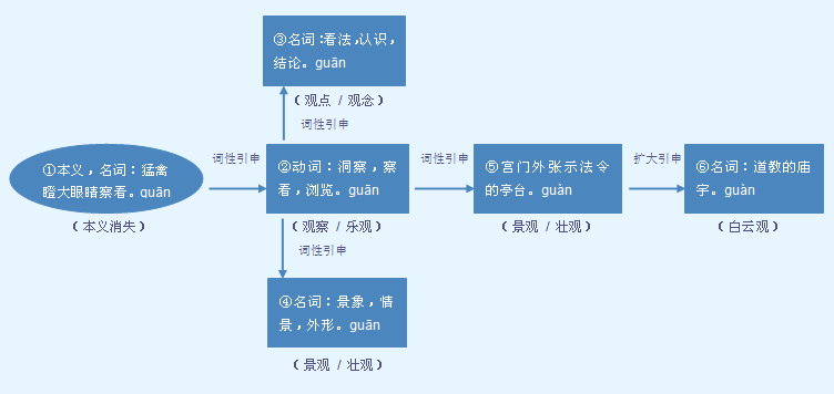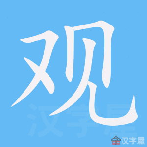释义 | ![]() (觀) 看。用于书面语。 a.用在固定词组中,或用作语素构成合成词。 走马~花|坐井~天|作壁上~|叹为~止|旁~|参~。 b.作带宾谓语。 纵~全局,形势大好|眼~六路,耳听八方。 景象或样子;对事物的认识或看法。常用作语素构成合成词。 奇~|旧~|外~|乐~|世界~|面面~。 【近】 〈动〉看 【词语】 观风 观感 观光 观礼 观摩 观念 观念形态 观望 观象台 观音 观瞻 观战 观众 【注意】 又读guàn,指道教的庙宇,如:白云观。 字源解说 “雚”是“觀”的本字。 雚,甲骨文 ![]() ![]() ![]() ![]() ![]() ![]() ![]() ![]() 附 文言版《説文解字》:觀,諦視也。从見雚聲。 附 白话版《说文解字》:观,谛视。字形采用“见”作边旁,“雚”。 引申线索 ![]() 【字族索引】 见 【同音字】 guān guàn |