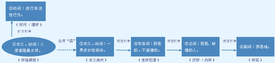 释义 | 奸 1 ★★★ 02175名![]() (*姦) 虚伪狡诈;不忠于君主或国家: 老~巨猾|忠~不分|那是一个大~大恶的人|乱世之~雄。 忠 zhōng 赤胆~心|~言逆耳|~良之士|~孝不能两全。 邪恶、伪诈的事或人。用于人时专指不忠于国家、君主的人或出卖国家、民族、阶级利益的人。常用在固定词组中作宾语,或用作语素构成合成词。 作~犯科|为民除~|内~|汉~|~臣。 自私,虚伪。用于口语。 a.作谓语,可带补语。 你这人才~哪,尽做出头露面的事|她~得很,同她打交道可得留神。 b.作宾语。 小伙子为人朴实,从不藏~耍滑。 【词语】 奸臣 奸宄 奸猾 奸计 奸佞 奸商 奸徒 奸污 奸细 奸险 奸笑 奸邪 奸雄 奸淫 奸诈 字源解说 本 字“奸” 干,既是声旁也是形旁,表示武器。奸,篆文 ![]() ![]() ![]() ![]() ![]() ![]() ![]() ![]() ![]() 合并字“姦”的读音 jiān ,这是合并简化过程发生的“变读”现象。 合并字“姦” 姦,金文 ![]() ![]() ![]() ![]() ![]() ![]() ![]() 奸 文言版《説文解字》:奸,犯婬也。从女,从干,干亦聲。 奸 白话版《说文解字》:奸,犯奸淫的罪恶。字形采用“女、干”会义,“干”也作声旁。 姦 文言版《説文解字》:姦,私也。从三女。 ![]() 姦 白话版《说文解字》:姦,私通。字形采用三个“女”会义。 ![]() 引申线索 ![]() 【字族索引】 干 【同音字】 jiān |