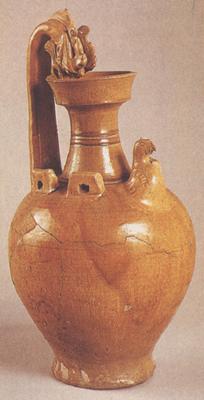 ◎盛酒器/北朝·北齐 1975年河北磁县东魏树村北齐文昭王高润墓出土 高44.5厘米 口径10.8厘米/河北省博物馆藏 ●此器为青黄色釉,釉质柔润,施釉薄厚不匀,厚处呈褐色。 器形为深腹、长颈、盘形口、平底。颈部中间紧束,饰凸弦纹两周。 肩部前置鸡首形流,后有龙首长柄连结于盘口及肩部。两侧各有方形横系两支。 此壶器身修长,重心合理稳定。长柄的设置既伸张了器形的气势,又便于以手提握。 整体造型挺拔、俊秀。特别是龙头鸡首造型生动,鸡昂首引颈,龙低头取食,俯仰变化各具神态,给器形增色添辉。 |
