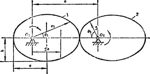 例5.2-25 椭圆齿轮机构  图中两相同椭圆齿轮以各自焦点为回转中心,其回转中心距离a等于椭圆的长轴,即a=2c。若椭圆齿轮焦点距离为2e,椭圆的偏心率λ=e/c,传动中两椭圆齿轮瞬心线作纯滚动,短轴长为2b,向径与极角的关系为  可见,其传动比i21为周期性变化。常用于自动机、印刷机等。 例5.2-26 卵形齿轮机构  以卵形齿轮的几何中心O1、O2作为回转中心的齿轮机构,具有较好的平衡性。中心距为a=b+c,向径r1与极角θ1的关系为: r1=2bc/〔(b+c)+(b-c)cos2θ1〕 |