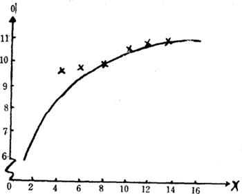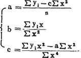 亦称“曲线式最小平方法”,即运用最小二乘法,求出倾向变动曲线,作为外推依据来进行预测。 倾向变动曲线方程一般为: Y=a+bx+cx2 通常用下式求解上式中的a、b、c数值。  有时非线性回归分析可用变量置换办法,把非线性问题转化成线性问题来求解。 例:盛钢水的钢包,在使用过程中,由于钢水的侵蚀,容积不断增大,其使用次数X与钢包容积增大量Y之间的数据如表所示。现要求找出次数X与容积增大量Y之间的关系,并建立预测模型。  从上表可看到,最初容积增大较快,以后逐渐减慢。当然钢包容积不会无限增大,即曲线必有一条平行于X轴的渐近线,选双曲线: 为拟合曲线。 并令  因此可用线性回归类方法求出a和b的值(详见“线性回归分析预测法”)。 计算结果为:a=0.0823b=0.1315 回归方程为:y′=0.0823+0.1315x′  标准离差  按表作散布图如下: