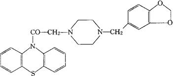 C26H25N3O3S=459.56 CAS-37561-27-6 10-[(4-胡椒基-1-哌嗪基)乙酰]吩噻嗪。 10-[(4-Piperonyl-1-piperazinyl)acetyl] phenothiazine. 10-[[4-(1,3-苯并二氧杂环戊烯-5-基甲基)-1-哌嗪基]乙酰]吩噻嗪。 10-[[4-(1,3-Benzodioxol-5-ylmethyl)-1-piperazinyl]-ncetyl]-10H-phenothiazine. 解痉药。 Fenoverine,Procalma,Spasmopriv. INN,DCF,USAN.