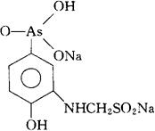 C7H8AsNNa2O6S=355.10 CAS-535-51-3 4-羟-间-苯胂酸,与甲醛次硫酸钠盐的化合物。 4-Hydroxy-m-arsanilic acid,compound with sodium formaldehydesulfoxylate. 5-胂羧基-2-(羟苯基)氨基甲亚磺酸二钠盐。 5-Arsono-2-(hydroxyphenyl)aminomethanesulfinic acid disodium salt. 抗感染药,抗阿米巴药。 Phenarsone Sulfoxylate,Aldarsone. INN,USAN,MI.