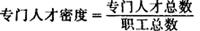 某一统计范围内的专门人才总数与职工总数的比值。公式为: