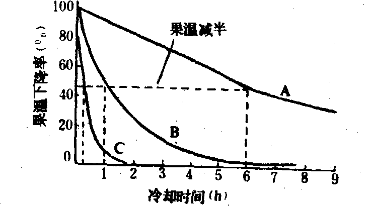 果实在预冷中要注意冷却效率。冷却效率取决于速度与终温。例如, 带包装箱的桃, 采用不同冷却方式, 其冷却速度不同(图2)。强制通风冷却B比自然对流冷却A的果温下降快, 比率为6:1,散装水冷C的速度则只要几分钟。 ![]() 图2 桃的预冷速度比较 |