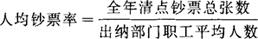 指银行出纳部门全年清点钞票总张数与该部门职工平均人数之比率。是反映该部门业务量和工作效率的指标。其计算公式: