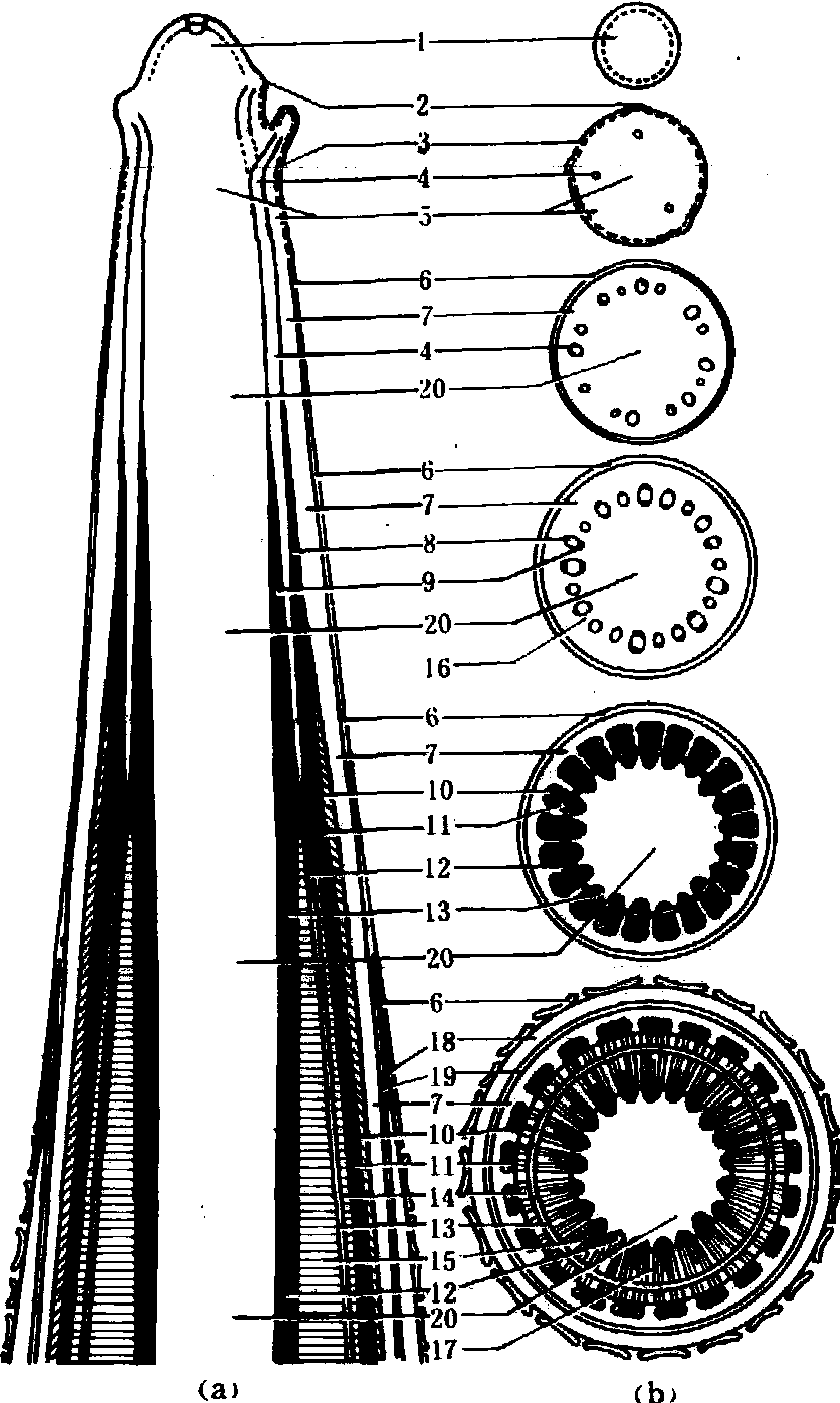 表皮 包被于幼茎的最外层,由原表皮发育而来,为一层稍呈砖形的细胞所组成。细胞的长轴与茎的纵轴平行排列。除少数沉水植物外,绝大多数植物茎的表皮细胞,其外切向壁常角质化,形成角质膜。有些植物有表皮毛或腺毛、钩毛,具有增强植物的保护功能。茎表皮上还有气孔器分布。 皮层 位于表皮和维管系统之间,发源于基本分生组织。薄壁组织为构成皮层的主要组织,靠近表皮的一至数层细胞常分化为厚角组织,内含叶绿体。有些双子叶植物茎的皮层分化出乳汁管或分泌腔、分泌道、气腔,含单宁细胞、含晶体细胞。松柏类植物茎的皮层中一般没有机械组织,但有树脂道分布。大多数种子植物皮层的最内层细胞,其细胞壁上无凯氏带增厚。某些双子叶植物茎内有具凯氏带的内皮层分化,如马兜铃科以及爵床科的穿心莲属、山牵牛属,苋科的莲子草属,菊科的紫菀属和莴苣属,桔梗科的兰花参属、风铃草属,旋花科的旋花属,野牡丹科的谷木属,唇形科的夏枯草属、黄芩属、水苏属,胡椒科的胡椒属等的某些种。有些植物皮层的最内一层或数层细胞常含有淀粉,称为淀粉鞘。如果没有凯氏带加厚和淀粉积累时,有时可从维管组织和皮层组织所产生物质的化学性质,追寻生理上的分界。 维管系统 许多由原形成层发育而来的维管束共同组成的初生维管系统,也可理解为维管柱。维管束呈环状排列于皮层的内侧,由于茎中无中柱鞘,维管系统和皮层的分界不明显,但有些双子叶植物的茎具有较发达的初生韧皮纤维,可借此作为划分二者的临界组织。每一维管束由初生韧皮部、初生木质部和形成层组成,为外韧维管束。但有些草本双子叶植物如毛茛属、莲属,其维管束没有形成层。维管束之间的区域为髓射线(初生射线)。幼茎的维管束之间的距离较大,多数木本植物的距离很小,几乎连成完整的环。与叶、枝相连的维管束,在茎内分别形成叶迹与枝迹,并相应产生叶隙和枝隙。茎的初生韧皮部从外侧开始分化出原生韧皮部,然后由外至内向心分化出后生韧皮部,称为外始式。初生木质部则先从内侧开始,由内至外离心发育,依次形成原生木质部和后生木质部,这种分化成熟过程称为内始式,是茎初生结构的重要特征之一。 髓射线由薄壁细胞组成,在茎横切面上呈辐射状排列,其外端与皮层相连,内端直达髓部,兼有贮藏养料和横向运输的作用。 髓 位于茎的中央,细胞薄壁,富含养料,但常有一些细胞形成木质化增厚的细胞壁或发育为石细胞,如苏铁、樟。有些植物如椴树,在髓的周围紧靠初生维管束的区域产生一些体积较小、排列较密的细胞,组成环髓带。也有些植物的髓在生长过程中; 中央毁坏成髓腔(芹菜),或残留一些呈水平分隔的片状髓组织(胡桃属、枫杨属)。 单子叶植物茎的初生结构 一般单子叶植物茎只形成初生结构,而无次生结构,有限维管束散生分布于基本组织中,在表皮以内没有皮层、髓和髓射线的界限。 禾本科植物茎的表皮包括细胞壁角化的长细胞和细胞壁栓化或硅化的短细胞以及气孔器。基本组织由薄壁细胞组成,占茎体积的大部分。老茎中,紧接表皮内的一至数层细胞常发育为厚壁细胞,加强了茎的固持性能。玉米、高粱、甘蔗茎的中央充满薄壁细胞,为实心结构; 稻、小麦、燕麦、竹等的茎,中央薄壁细胞解体,形成髓腔。其散生维管束靠近茎外围的较小,多为叶迹维管束,分布紧密; 越近茎中心的维管束越大,分布稀远,由叶迹与茎的维管束连接而来。维管束的远轴部分为韧皮部,其中原生韧皮部因受挤压早期破坏,后生韧皮部保持生理活性。木质部的中间纵列为1~3个环纹和螺纹导管以及少量木薄壁细胞,属于原生木质部。环纹导管有时在生长中被拉破,形成腔隙。木质部的左右两侧各有一个大的孔纹导管,属于后生木质部。整个维管束的外周为厚壁机械组织构成的维管束鞘所包围。 少数单子叶植物茎可发生初生加厚生长,如玉米、甘蔗、棕榈的茎,除了初生组织的细胞体积可以长大外,主要是在叶原基下面,靠近茎轴周围的区域上出现初生加厚分生组织。它们由顶端分生组织衍生而来,细胞扁平,呈纵行排列,有分裂能力。初生增粗分生组织主要通过平周分裂,形成许多薄壁组织细胞以及贯穿于薄壁组织中的原形成层,使幼茎直径在离顶端分生组织不远处即能迅速增大。 茎的次生生长 双子叶植物和松柏类植物茎的次生结构 裸子植物和大多数双子叶植物的茎,在初生生长的基础上出现形成层和木栓形成层,能进行次生生长,产生次生结构。草本双子叶植物茎的次生生长时间较短,木本的则可持续多年。 形成层及活动 茎内的形成层依发生部位不同分束中形成层和束间形成层。束中形成层分裂产生次生韧皮部和次生木质部,增添于原来维管束中的初生韧皮部和初生木质部之间。束间形成层的分裂产物,在有的植物(如葡萄属、马兜铃属)中只是射线薄壁组织,而在另一些植物(如蓖麻属、柳属)中,可以形成新的维管束。有些草本双子叶植物茎中,只有束中形成层而无束间形成层。绝大多数木本植物(如椴树属等)的维管束相互紧靠,髓射线狭窄。 双子叶植物茎的次生韧皮部包含筛管、伴胞、韧皮薄壁细胞、韧皮纤维等成分,其射线有单列、二列和多列等形式。有的植物如杜仲、三叶胶的次生韧皮部中还有乳汁管。裸子植物的次生韧皮部中无筛管和伴胞,只形成筛胞